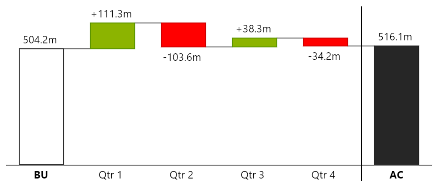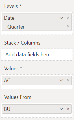 Unlike the regular delta waterfall charts, you can stack several measures in each field ("Values From" and "Values"). The result is a comparison of the sum of all start measures against the sum of all end measures. However, stacking by a dimension like in regular delta waterfalls cannot be applied here. The focus is on the aggregate comparison of the start and end measures.