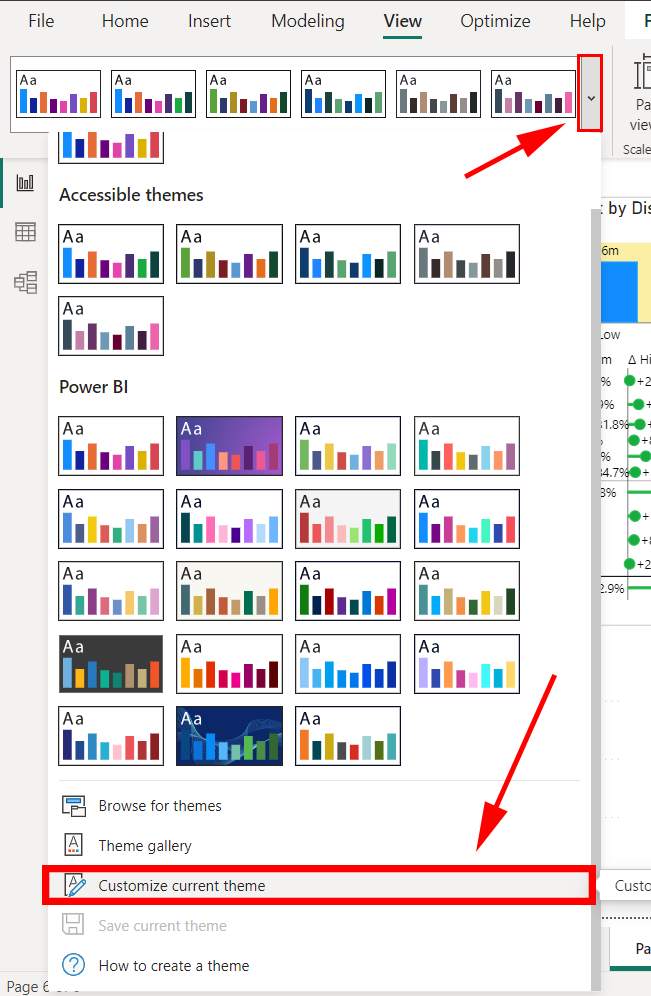 You can customize the theme settings in Power BI on the **View** ribbon. Then open the theme selection and click **Customize current theme**.