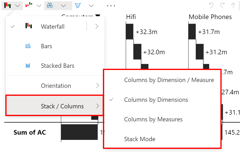 Besides adding multiple measures into the *Values* field, you can create a stacked waterfall or bar chart by adding a dimension into the *Stack / Columns* field while in **Stack Mode**.